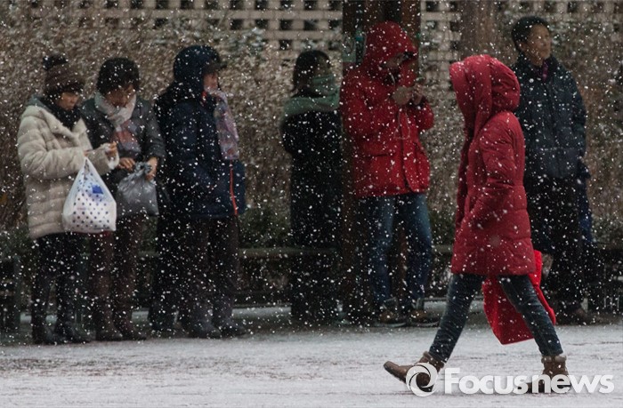 (서울=포커스뉴스) 서울을 포함한 중부지방에 많은 눈이 내린 13일 오후 서울 성북구 길음역 근처에서 시민들이 발걸음을 재촉하고 있다.