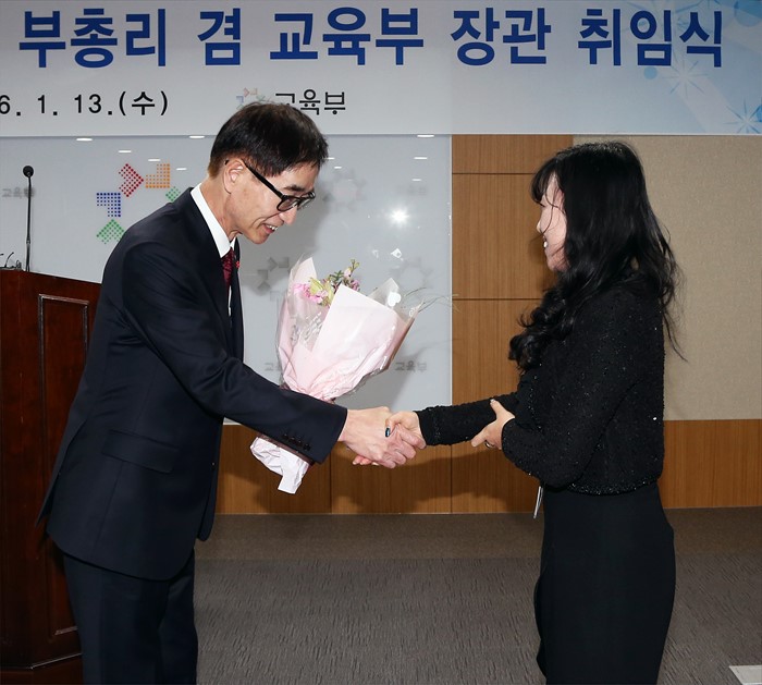 (세종=포커스뉴스) 이준식 사회부총리 겸 교육부장관이 13일 오후 세종시 정부세종청사 교육부 대회의실에서 열린 취임식에서 직원으로부터 꽃다발을 받고 있다. <사진제공=교육부>