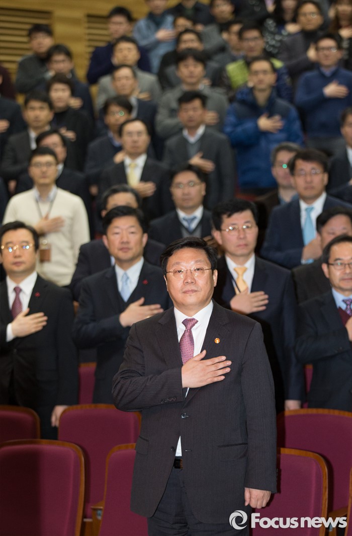 (세종=포커스뉴스) 주형환 신임 산업통상자원부장관이 13일 오후 세종시 정부세종청사 산업부 대강당에서 열린 취임식에 참석해 국기에 대한 경례를 하고 있다.