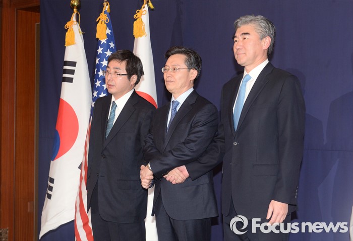 (서울=포커스뉴스) 한미일 6자회담 수석대표가 4차 핵실험을 감행한 북한에 대한 강력하고 실효적인 제재 방안 논의를 위해 13일 오후 서울 소공동 롯데호텔에서 만나 악수하고 있다. 왼쪽부터 이시카네 기미히로(石兼公博) 일본 아시아대양주국장, 황준국 외교부 한반도평화교섭본부장, 성 김 미 국무부 대북정책특별대표.