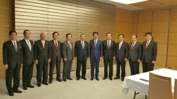 (서울=포커스뉴스) 13일(현지시간) 일본 도쿄 총리관저에서 서청원(오른쪽 네번째) 새누리당 최고위원을 비롯한 한일의원연맹 소속 여·야 의원들이 아베 신조(오른쪽 다섯번째) 일본 총리와 면담을 마치고 기념촬영을 하고 있다. <사진제공=서청원 의원실>
