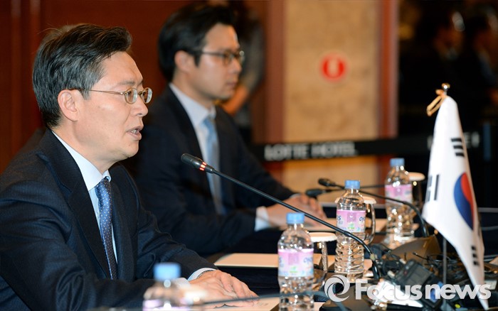 (서울=포커스뉴스) 13일 오후 서울 중구 롯데호텔에서 열린 '한미일 북핵 6자수석 회동'에서 황준국 외교부 한반도평화교섭본부장이 모두발언을 하고 있다.