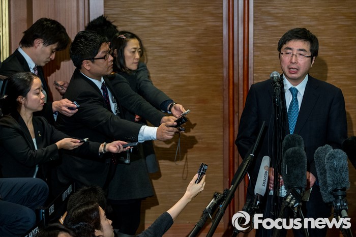 (서울=포커스뉴스) 이시카네 기미히로 일본 아시아대양주국장이 13일 오후 서울 중구 롯데호텔에서 열린 '한미일 6자회담 수석대표 긴급회동'에 자리해 북한 4차 핵실험 강행 관련 대북제재 방안 논의를 마친 뒤 입장발표를 하고 있다.