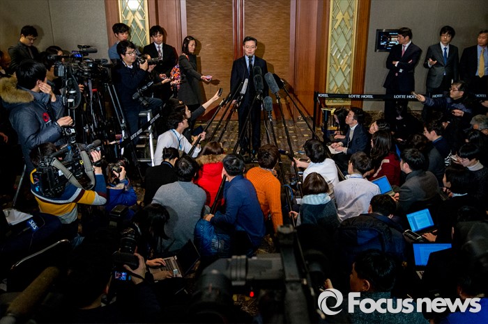 (서울=포커스뉴스) 황준국 외교부 한반도평화교섭본부장이 13일 오후 서울 중구 롯데호텔에서 열린 '한미일 6자회담 수석대표 긴급회동'에 자리해 북한 4차 핵실험 강행 관련 대북제재 방안 논의를 마친 뒤 입장발표를 하고 있다.