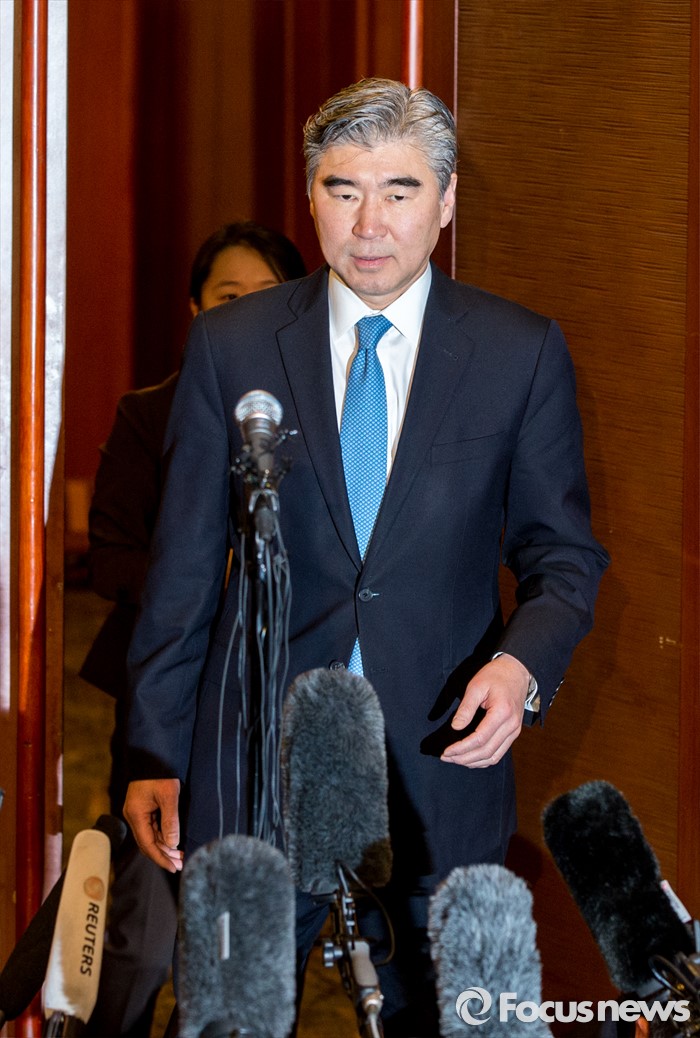 (서울=포커스뉴스) 성 김 미국 국무부 대북정책특별대표가 13일 오후 서울 중구 롯데호텔에서 열린 '한미일 6자회담 수석대표 긴급회동'에 자리해 북한 4차 핵실험 강행 관련 대북제재 방안 논의를 마친 뒤 입장발표 하기 위해 회동장을 나서고 있다.