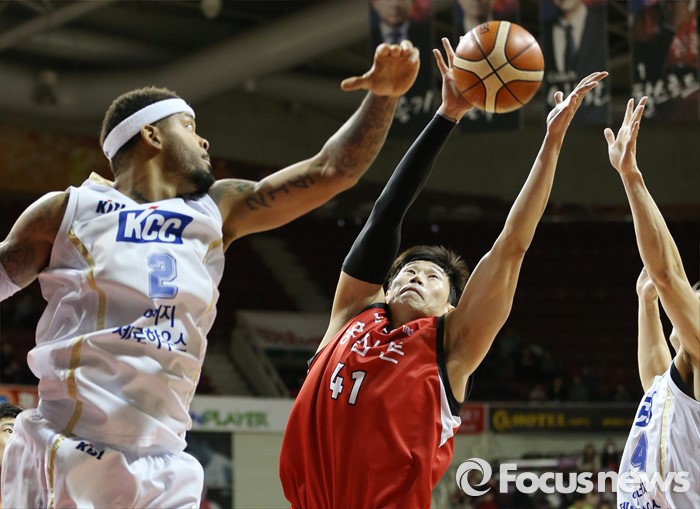 (안양=포커스뉴스) 13일 안양실내체육관에서 열린 2015-2016 프로농구 KGC-KCC 경기에서 KGC 오세근이 KCC 안드레 에밋을 제치고 리바운드볼을 잡고 있다.