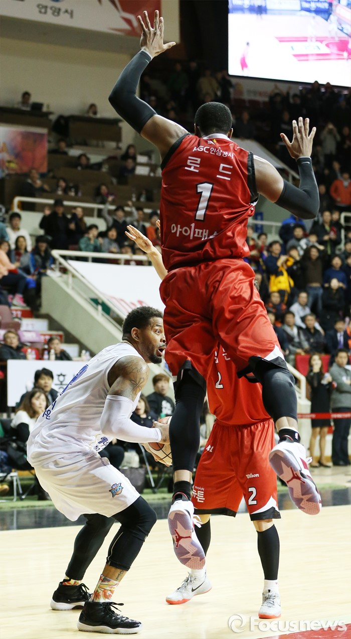 (안양=포커스뉴스) 13일 안양실내체육관에서 열린 2015-2016 프로농구 KGC-KCC 경기에서 KCC 안드레 에밋의 슈팅 동작에 속은 KGC 찰스 로드가 뛰어 오르며 막으려하고 있다.