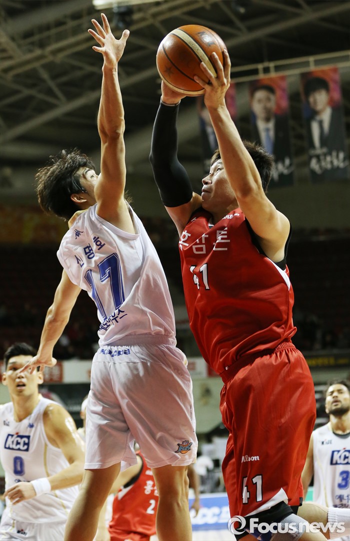 (안양=포커스뉴스) 13일 안양실내체육관에서 열린 2015-2016 프로농구 KGC-KCC 경기에서 KGC 오세근의 점프슛때KCC 신명호가 손을 뻗으며 슛블록을 시도하고 있다.