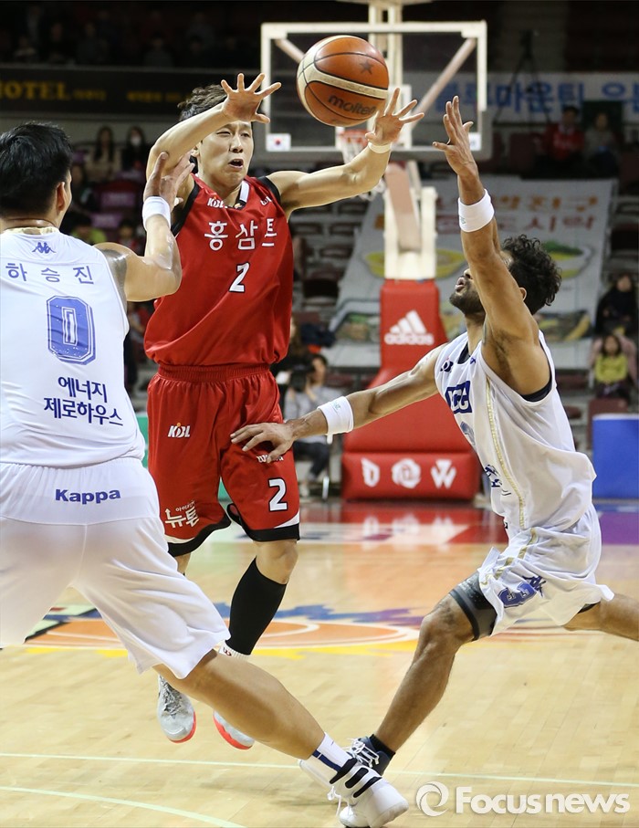 (안양=포커스뉴스) 13일 안양실내체육관에서 열린 2015-2016 프로농구 KGC-KCC 경기에서 KGC 김기윤이 KCC 전태풍의 마크를 피해 패스하고 있다.