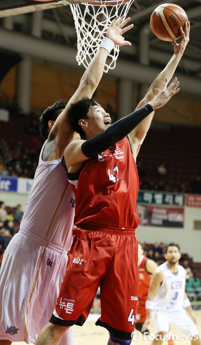(안양=포커스뉴스) 13일 안양실내체육관에서 열린 2015-2016 프로농구 KGC-KCC 경기에서 KGC 오세근이 KCC 하승진을 제치며 리버스 레이업슛을 시도하고 있다.