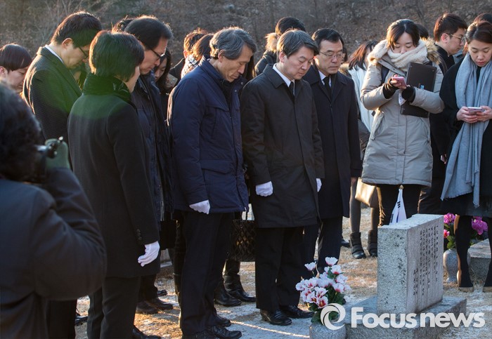 (서울=포커스뉴스) 14일 오전 서울 강북구 국립 4.19 민주묘지를 찾은 한상진 국민의당 창당준비위원장과 안철수 인재영입위원장이 혁명의 도화선이 됐던 고 김주열 열사의 묘비 앞에서 묵념하고 있다.