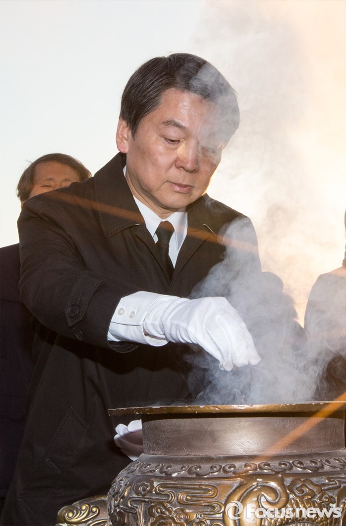 (서울=포커스뉴스) 14일 오전 서울 강북구 국립 4.19 민주묘지를 찾은 안철수 국민의당 인재영입위원장이 분향하고 있다.