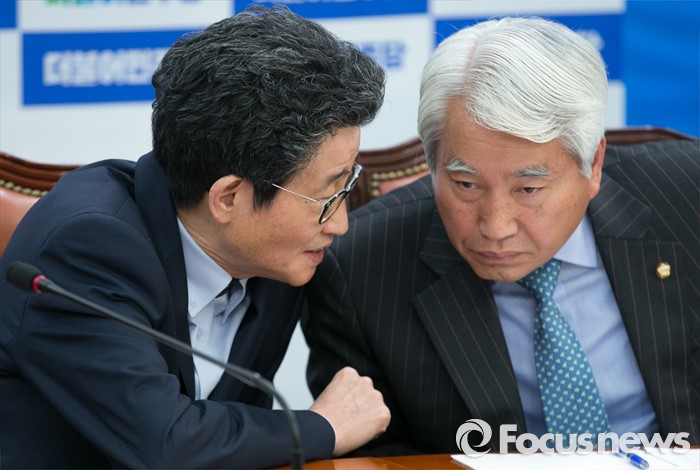 (서울=포커스뉴스) 이목희(왼쪽) 더불어민주당 정책위의장과 백군기 의원이 14일 오전 서울 여의도 국회에서 열린 정책조정회의에 참석해 대화하고 있다.