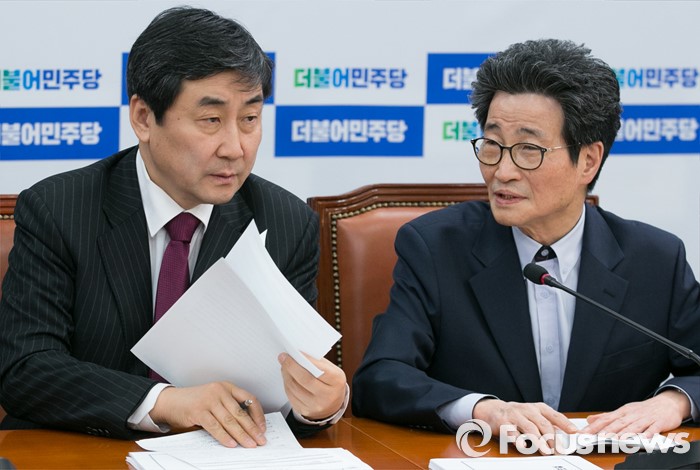 (서울=포커스뉴스) 이종걸(왼쪽) 더불어민주당 원내대표와 이목희 정책위의장이 14일 오전 서울 여의도 국회에서 열린 정책조정회의에 참석해 대화하고 있다.