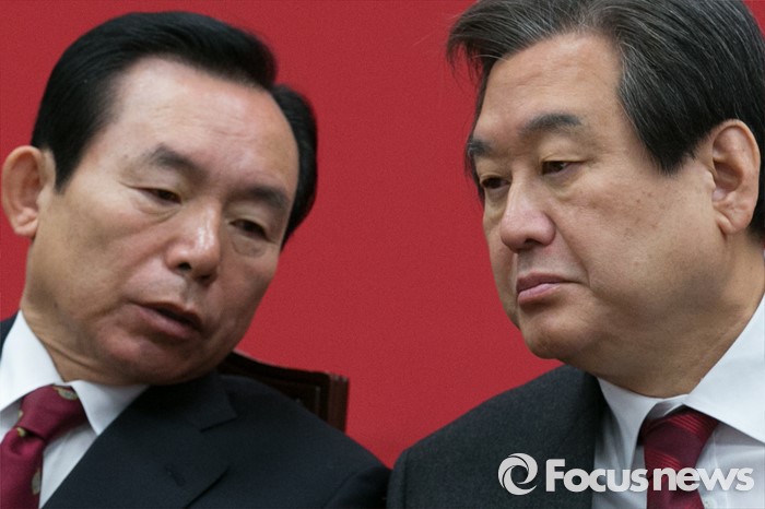 (서울=포커스뉴스) 김무성(오른쪽) 새누리당 대표와 이인제 최고위원이 14일 오전 서울 여의도 국회에서 열린 최고위원회의에 참석해 대화하고 있다.
