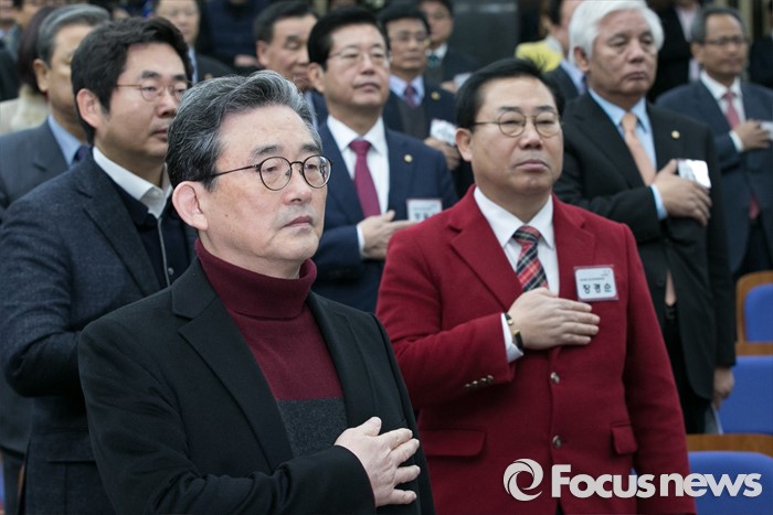 (서울=포커스뉴스) 이한구(앞) 새누리당 전국위원회 의장을 비롯한 위원들이 14일 오전 서울 여의도 국회에서 열린 제7차 상임전국위원회에 참석해 국민의례를 하고 있다.