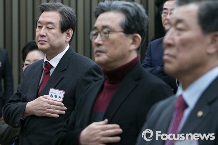 | △ 국민의례하는 김무성·이한구·황진하 |