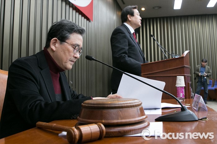 (서울=포커스뉴스) 이한구(왼쪽) 새누리당 전국위원회 의장이 14일 오전 서울 여의도 국회에서 열린 제7차 상임전국위원회에 참석해, 김무성 대표의 인사말을 경청하고 있다.