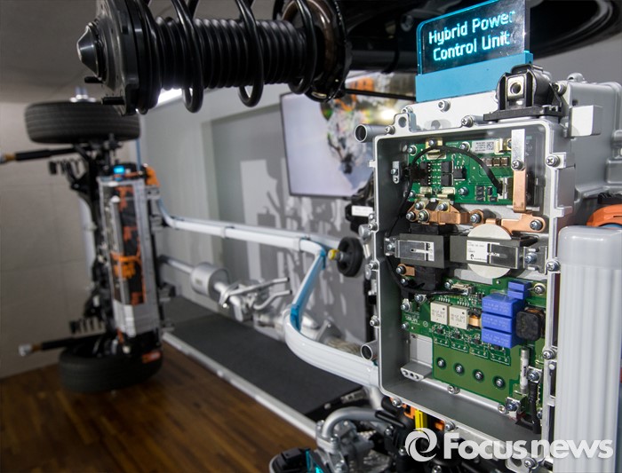 (서울=포커스뉴스) 현대자동차가 14일 오전 서울 중구 동대문디자인플라자에서 하이브리드 자동차 '아이오닉'을 선보였다. 이날 행사장에 전시된 아이오닉의 하이브리드 파워 콘트롤 유닛.