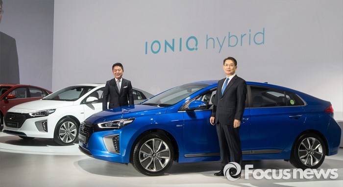 (서울=포커스뉴스) 14일 오전 서울 중구 동대문디자인플라자에서 권문식(오른쪽) 현대자동차 부회장과 곽진 부사장이 하이브리드 자동차 '아이오닉'을 선보이고 있다.