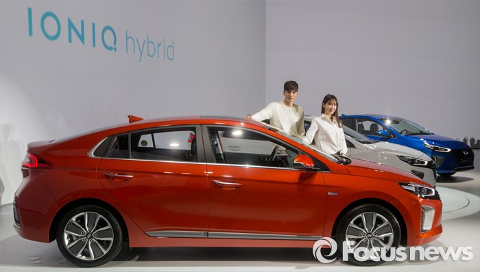 (서울=포커스뉴스) 14일 오전 서울 중구 동대문디자인플라자에서 모델들이 하이브리드 자동차 '아이오닉'을 선보이고 있다.