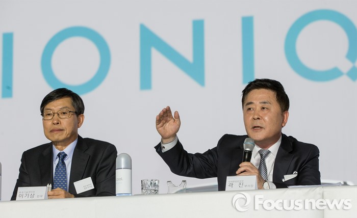 (서울=포커스뉴스) 14일 오전 서울 중구 동대문디자인플라자에서 곽진(오른쪽) 현대자동차 부사장이 하이브리드 자동차 '아이오닉'을 소개하고 있다.