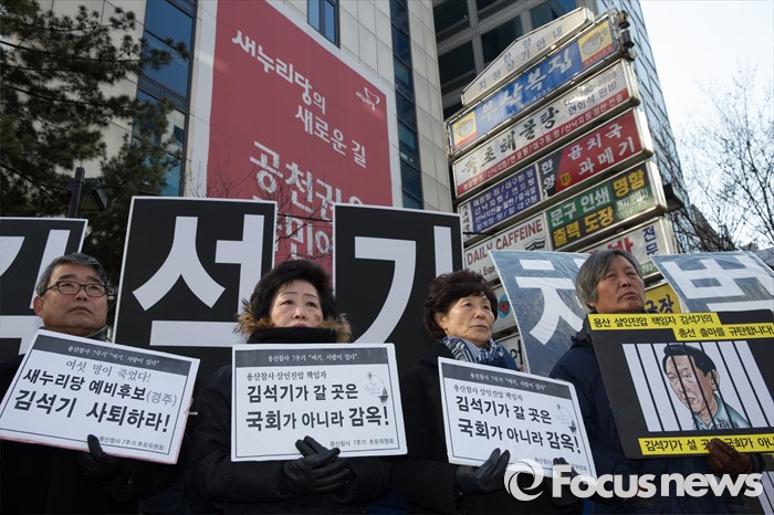 (서울=포커스뉴스) 용산참사 진상규명위원회 및 유가족들이 14일 오후 서울 영등포구 여의도 새누리당사앞에서 열린 새누리당 총선 예비후보(경주), 용산참사 책임자 김석기 규탄 기자회견을 열고 있다.