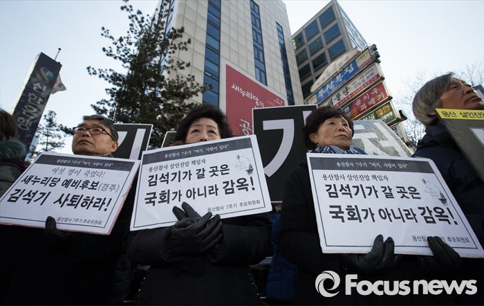 (서울=포커스뉴스) 용산참사 진상규명위원회 및 유가족들이 14일 오후 서울 영등포구 여의도 새누리당사앞에서 열린 새누리당 총선 예비후보(경주), 용산참사 책임자 김석기 규탄 기자회견을 열고 있다.