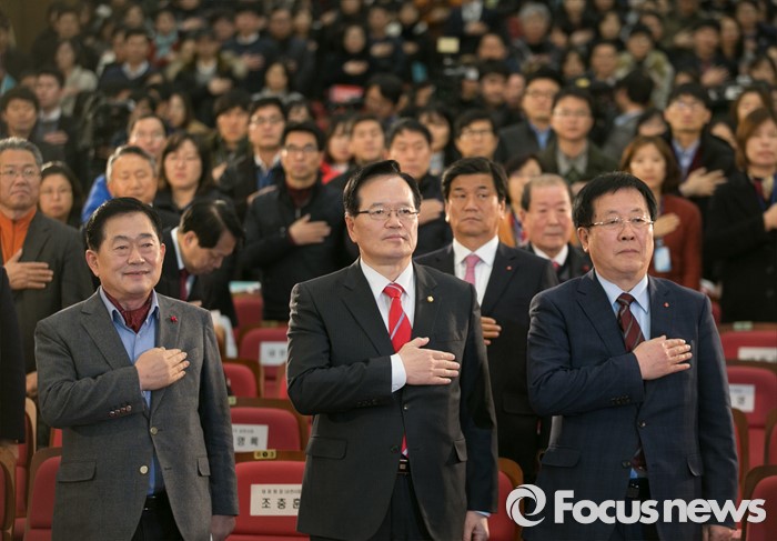 (서울=포커스뉴스) 정의화(가운데) 국회의장과 조충훈(왼쪽) 전국시장군수구청장협의회 대표회장, 조윤길 부회장 등 참석자들이 14일 오후 서울 여의도 국회 의원회관에서 열린 지방분권 개헌 대국민 토론회에 참석해 국기에 대한 경례를 하고 있다.