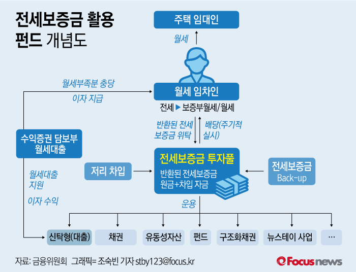 전세보증금의 투자풀(Pool)의 골자는 전세에서 월세나 보중부 월세로 전환해 살고 있는 임차인이 집 주인(임대인)으로부터 돌려받은 전세보증금과 차입자금이다. 전세 중심에서 월세로 주택시장이 구조적으로 변함에 따라 임차인에겐 의도치 않은 목돈이 발생했으나 수익성이 떨어지는 정기예금이나 단기자금으로만 써 활용도가 높지 않았다는 게 금융위의 설명이다.