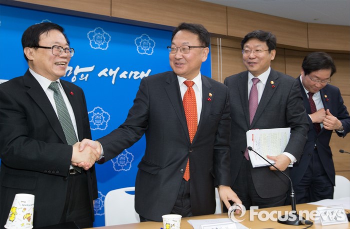 (세종=포커스뉴스) 유일호(왼쪽 두 번째) 경제부총리 겸 기획재정부장관이 14일 오후 세종시 정부세종청사 기획재정부 브리핑룸에서 내수·수출의 균형을 통한 경제활성화 관계부처 합동브리핑을 마치고 이동필 농림축산식품부장관과 악수를 하고 있다.