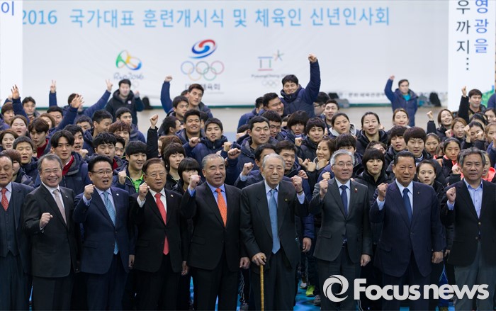 (서울=포커스뉴스) 14일 오후 서울 노원구 태릉선수촌 오륜관에서 열린 2016년 국가대표 훈련개시식 및 체육인 신년인사회에서 내빈들과 국가대표 선수들이 파이팅을 외치고 있다.