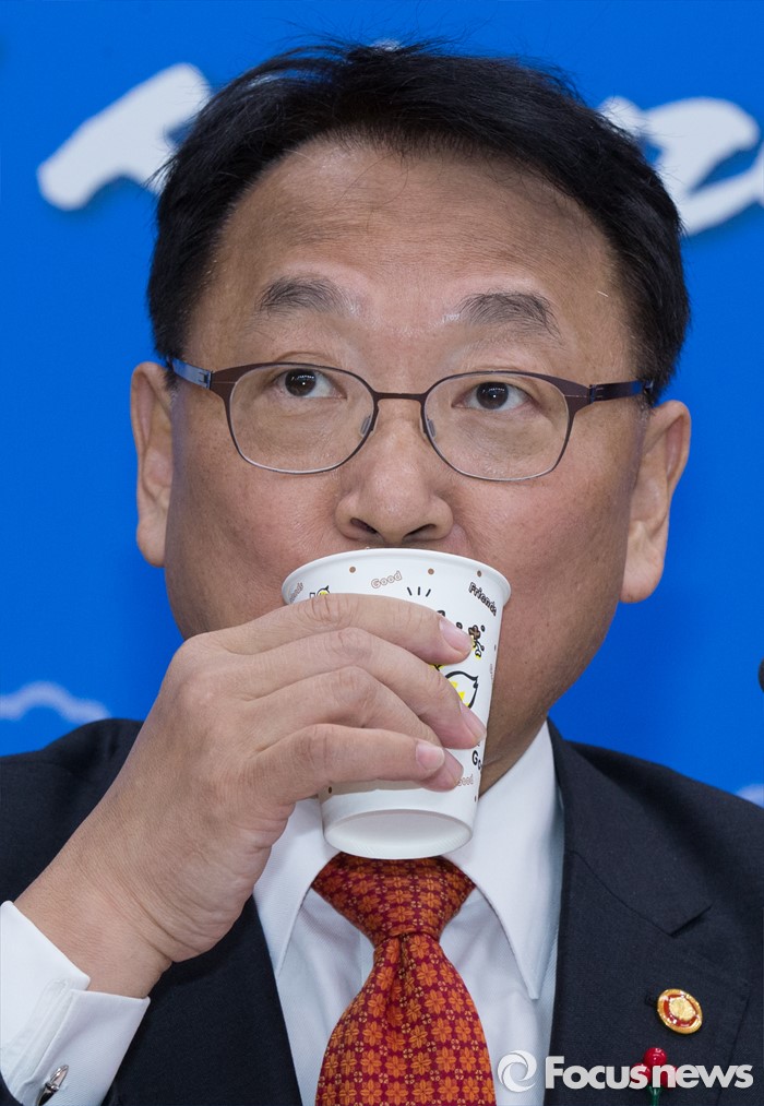 (세종=포커스뉴스) 유일호 경제부총리 겸 기획재정부장관이 14일 오후 세종시 정부세종청사 기획재정부 브리핑룸에서 내수·수출의 균형을 통한 경제활성화 관계부처 합동브리핑 중 목을 축이고 있다.