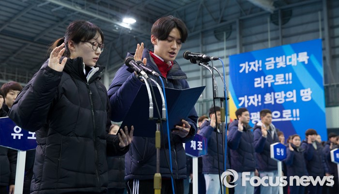 (서울=포커스뉴스) 14일 오후 서울 노원구 태릉선수촌 오륜관에서 열린 2016년 국가대표 훈련개시식 및 체육인 신년인사회에서 태권도 국가대표 이대훈(오른쪽부터)과 빙상 국가대표 최민정이 선수대표로 선서를 하고 있다.