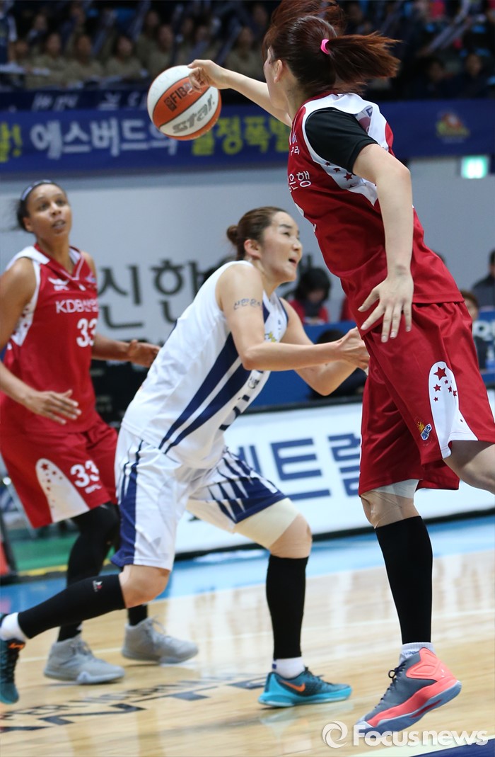 (인천=포커스뉴스) 14일 인천도원체육관에서 열린 2015~2016 여자프로농구 신한은행-KDB생명 경기에서 KDB생명 김소담이 바운드된 볼을 플레넷에게 쳐내고 있다.