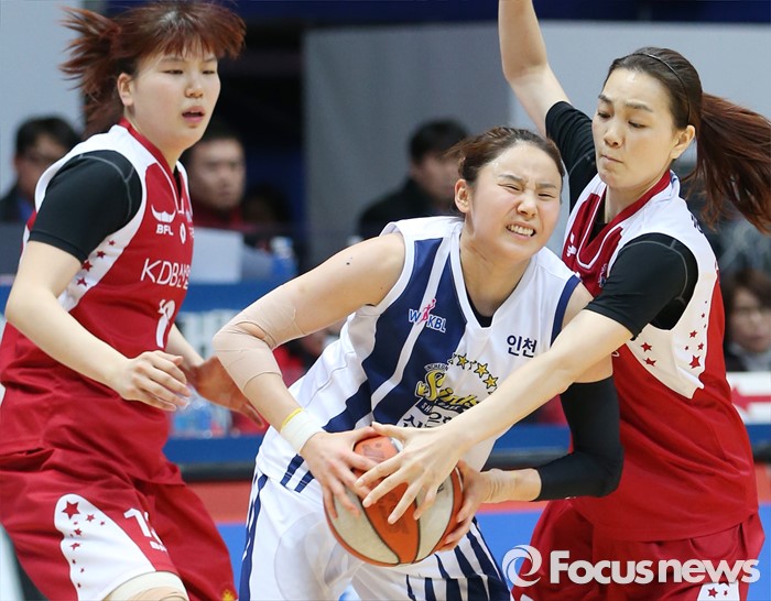 (인천=포커스뉴스) 14일 인천도원체육관에서 열린 2015~2016 여자프로농구 신한은행-KDB생명 경기에서 신한은행 최윤아를 KDB생명 김소담(13)과 한채진이 에워싸며 진로를 봉쇄하고 있다.