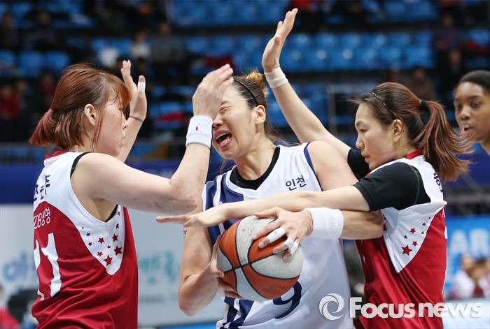 (인천=포커스뉴스) 14일 인천도원체육관에서 열린 2015~2016 여자프로농구 신한은행-KDB생명 경기에서 신한은행 곽주영이 KDB생명 한채진(오른쪽), 조은주의 협력수비를 빠져 나가려하고 있다.