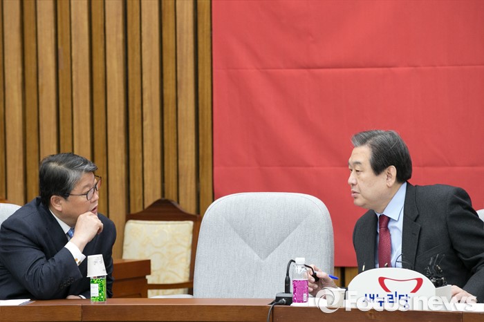 (서울=포커스뉴스) 김무성(오른쪽) 새누리당 대표와 조원진 원내수석부대표가 15일 오전 서울 여의도 국회에서 열린 주요당직자회의에 참석해 대화하고 있다.