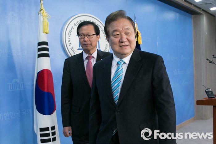 (서울=포커스뉴스) 정대철(오른쪽) 더불어민주당 상임고문이 15일 오전 서울 여의도 국회 정론관에서 탈당 표명 기자회견을 마치고 퇴장하고 있다.