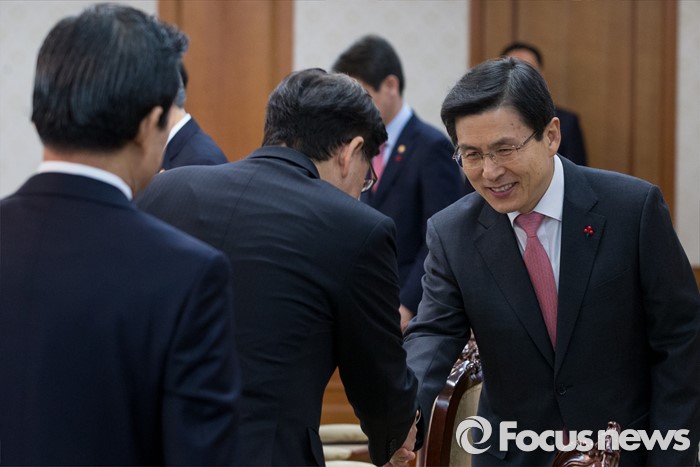 (서울=포커스뉴스) 15일 오전 서울 종로구 정부서울청사에서 열린 국가정책조정회의에 참석한 황교안 국무총리가 장관들과 악수하고 있다.