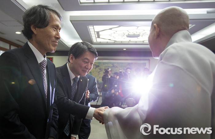 (서울=포커스뉴스) '국민의당' 안철수 의원과 한상진 창당준비위원장이 15일 오전 서울 종로구 조계사에서 자승 총무원장과 새해 인사를 나누고 있다.