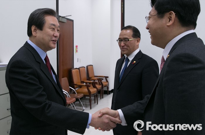 (서울=포커스뉴스) 주형환(오른쪽) 산업통상자원부 장관과 홍윤식(가운데) 행정자치부 장관이 15일 오전 서울 여의도 국회에서 새누리당 지도부를 취임 인사 차 예방, 김무성 대표와 인사하고 있다.