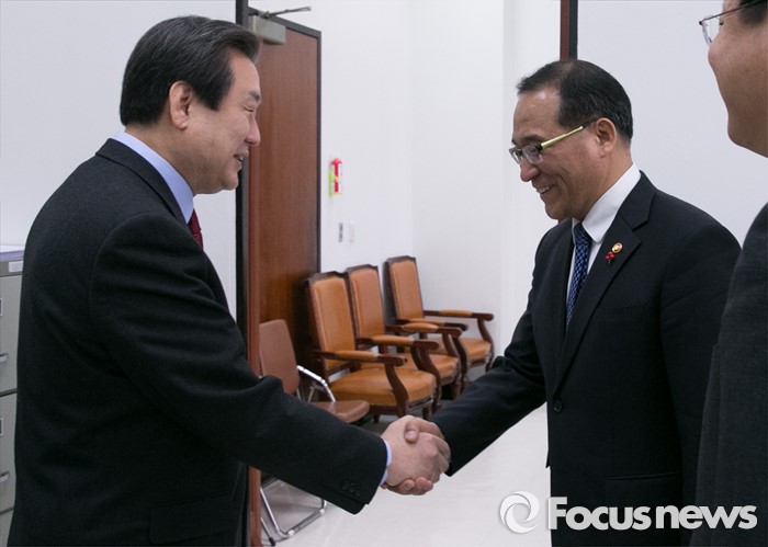 (서울=포커스뉴스) 홍윤식(오른쪽) 행정자치부 장관이 15일 오전 서울 여의도 국회에서 새누리당 지도부를 취임 인사 차 예방, 김무성 대표와 인사하고 있다.