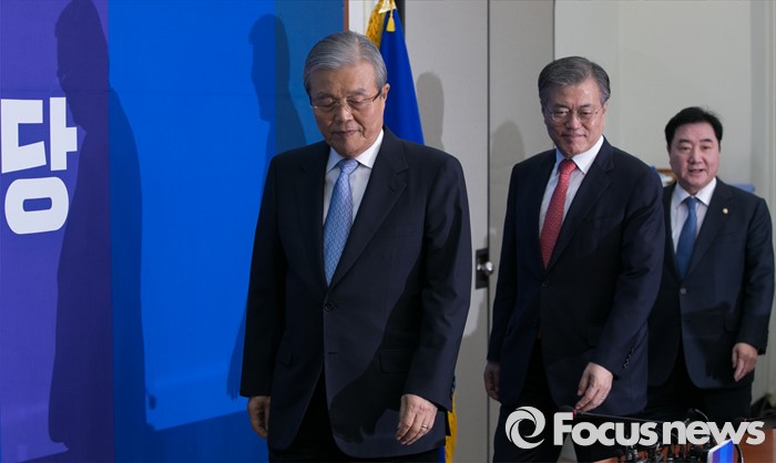 (서울=포커스뉴스) 더불어민주당 조기선대위원장으로 영입된 김종인(왼쪽) 전 새누리당 국민행복추진위원장이 15일 오전 서울 여의도 국회에서 기자간담회에 앞서 문재인(가운데) 대표와 함께 입장하고 있다.