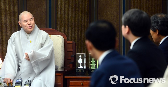 (서울=포커스뉴스) 불교 조계종 자승 총무원장이 15일 오전 서울 종로구 한국불교역사문화기념관에서 국민의당 안철수 인재영입위원장을 비롯한 지도부에게 덕담을 하고 있다.