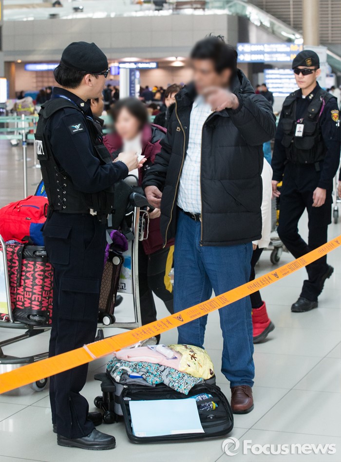 (인천공항=포커스뉴스) 한국공항공사 콜센터로 '전국공항'에 폭발물을 설치 했다는 협박 전화가 걸려온 15일 오후 인천국제공항 출국장에서 공항경찰대원들이 검문검색을 하고 있다.
