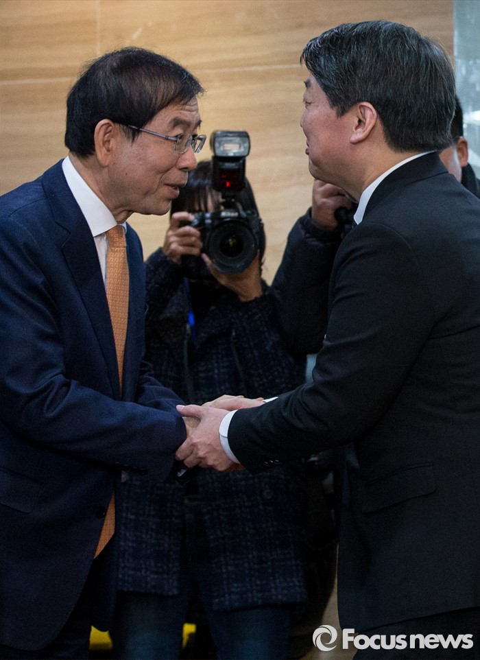 (서울=포커스뉴스) 15일 오후 서울 노원구청 대강당에서 열린 2016 노원구 신년인사회에 참석한 박원순(왼쪽) 서울시장과 안철수 국민의당 인재영입위원장이 악수하고 있다.