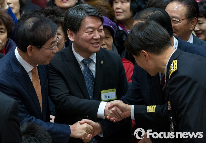 (서울=포커스뉴스) 15일 오후 서울 노원구청 대강당에서 열린 2016 노원구 신년인사회에 참석한 안철수 국민의당 인재영입위원장이박원순 서울시장, 윤득수 노원소방서장과악수하고 있다.