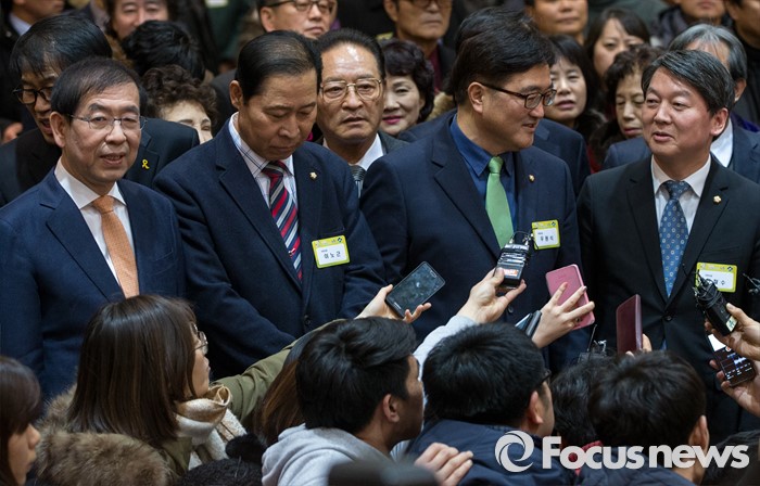 (서울=포커스뉴스) 15일 오후 서울 노원구청 대강당에서 열린 2016 노원구 신년인사회에 참석한 안철수(맨 오른쪽) 국민의당 인재영입위원장이 취재진의 질문세례를 받하고 있다.