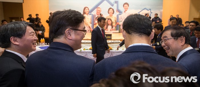 (서울=포커스뉴스) 15일 오후 서울 노원구청 대강당에서 열린 2016 노원구 신년인사회에 참석한 안철수(맨 왼쪽) 국민의당 인재영입위원장과박원순(맨 오른쪽) 서울시장이 대화하고 있다.